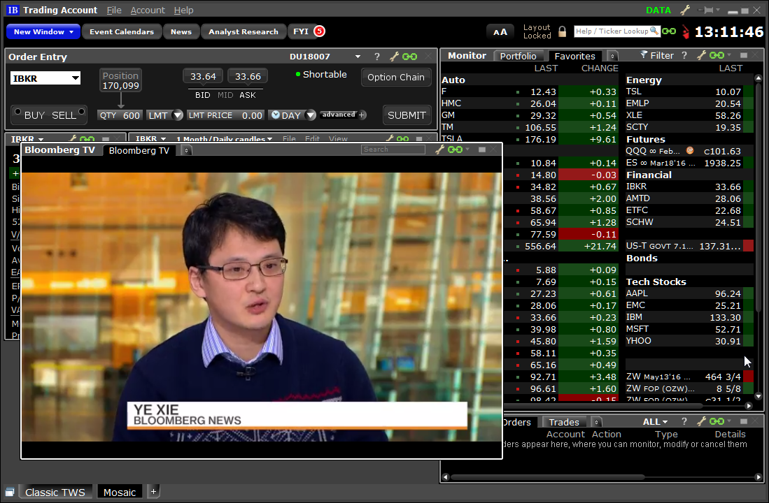 现在,将Bloomberg TV添加为新闻报送后,您便可在TWS的新闻面板中直接观看实时直播视频。该功能对模拟和真实交易账户均免费提供。使用窗口底部的滑动条可从视频切换成仅音频模式,使用窗口左下角的控制器可随时暂停实时报送。通过双击窗口的标题栏或点击右下角“全屏”图标可扩大观看屏幕。