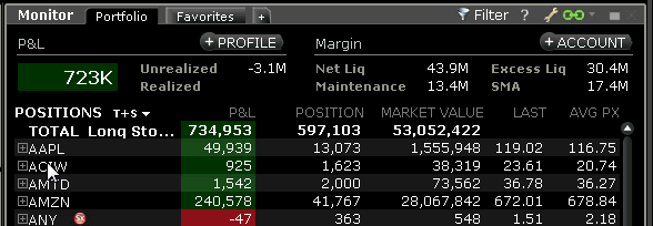 注资策略后,TWS投资组合中显示的头寸前都会出现一个“+”标志。点击展开头寸,查看资产的作为策略中的单个头寸各项,以及作为“独立”头寸(或非策略部分)的资产。